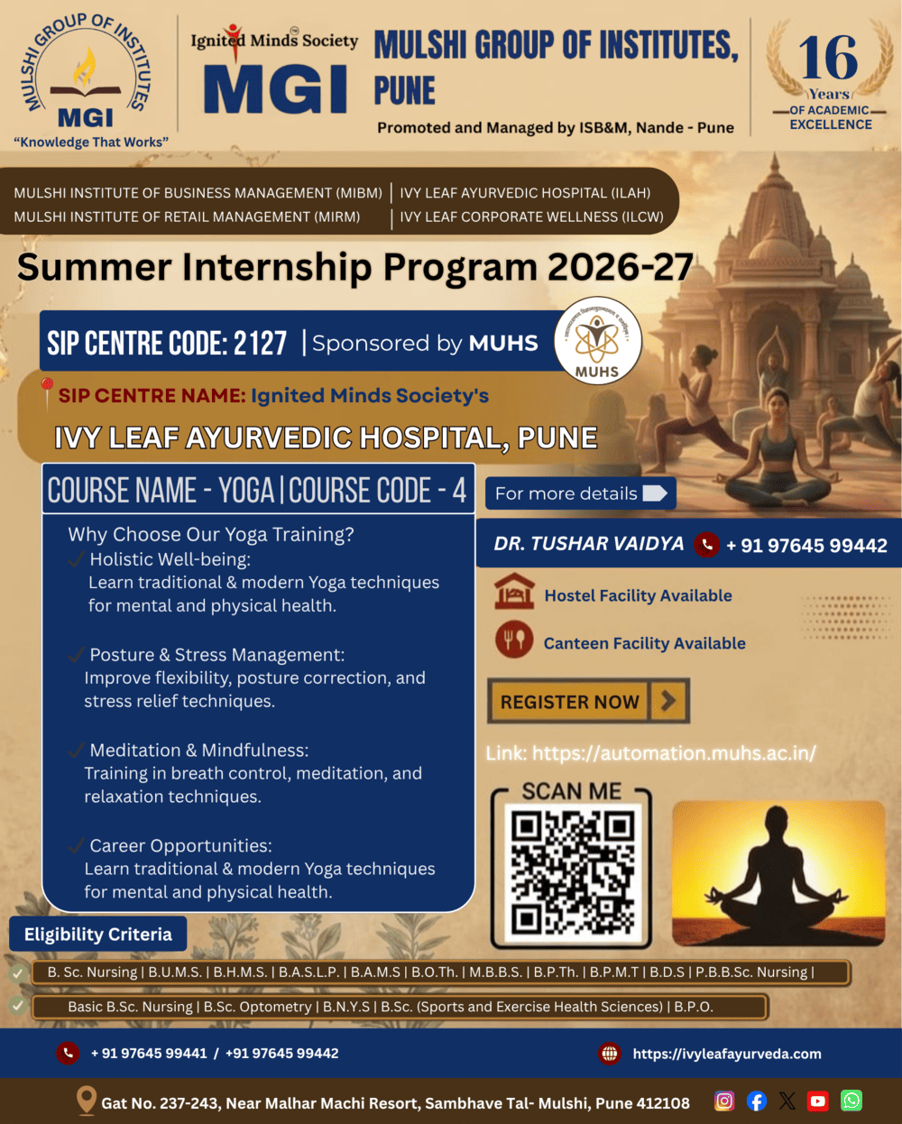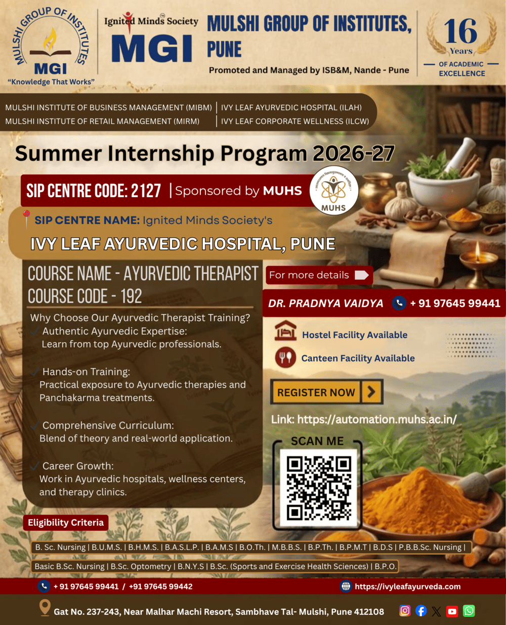 Ivy Leaf Ayurvedic Hospital is located on a plateau of Sahyadri Mountain ranges overlooking majestic Mulshi Dam Ivy Leaf Ayurvedic hospital is promoted under the aegis of Ignited Mind Society (IMS)that is formed by a team of academicians, researchers, Managers from IIM and IIT back ground and eminent professional Doctors.